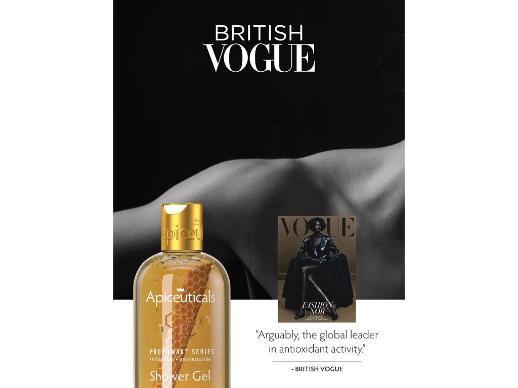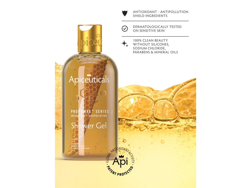 Sprchový gel PROPOWAX™ s antioxidantem přeměňuje každodenní koupel na ochranný rituál. Díky své jedinečné medové textuře zahalí pokožku do hedvábné jemnosti a zároveň ji jemně čistí. Díky patentované technologii Living Honeycomb, která prokazatelně poskytuje nejvyšší antioxidační aktivitu na světě, chrání před znečištěním, zpomaluje stárnutí pokožky a udržuje dlouhotrvající hydrataci. Zanechává pokožku jemnou, zářivou a zahalenou v ultra luxusní vůni Apiceuticals.
