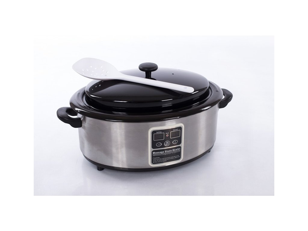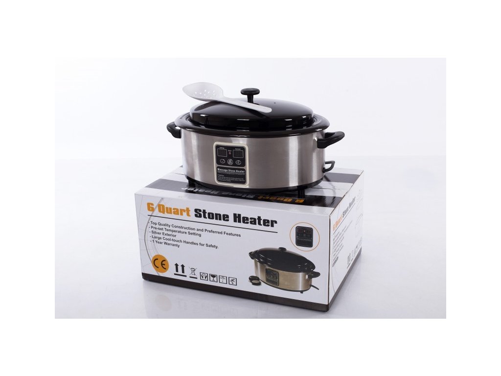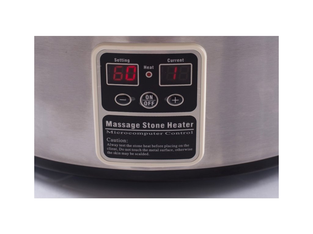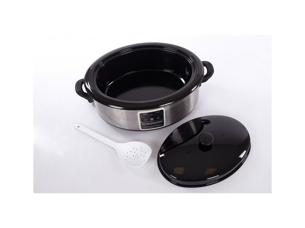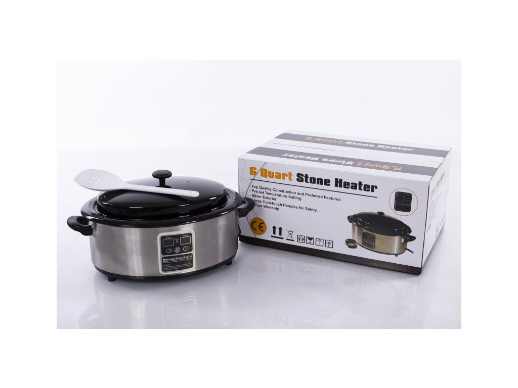 Ohřívač lávových kamenů je ze tří částí: z vnější nerezové části, na které je umístěn také digitální displej, z vyjímatelné vaničky o objemu 6l a z poklice, která je teplu odolná. Nádoba je vyrobena z ušlechtilé oceli a pevného plastu. Výhodou ohřevné nádoby s digitálním displejem je jednoduchá a rychlá manipulace. Ohřevná nádoba je vybavena funkcí předehřívání lávových kamenů. Objem 6l Vám zajistí dostatek místa pro zahřátí celé sady.