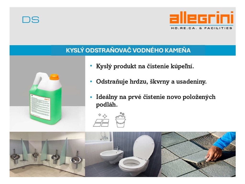 DS je kyselý odvápňovací prostředek pro sanitární použití, ideální pro všeobecné čištění toalet, koupelen, bazénových prostor a všech typů obkládaných povrchů, jako je kamenina, keramika a terakota. Odstraňuje rez, skvrny a usazeniny z toaletních mís a zanechává povrchy beze zbytků. Snadno odstraňuje zbytky malty a betonu.