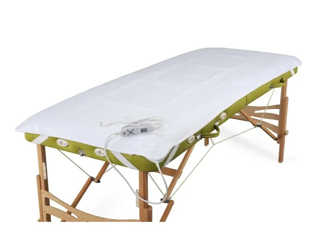 Elektrická topná podložka ovládaná dálkovým ovladačem, který umožňuje kontrolu teploty a času ohřevu. Podložka je určena k vyhřívání desky masážního stolu o rozměrech do 70 x 180 cm. Podložka má praktické úchyty pro upevnění k desce stolu. Pro maximální pohodlí se vyplatí na podložku použít dodatečný ochranný kryt.