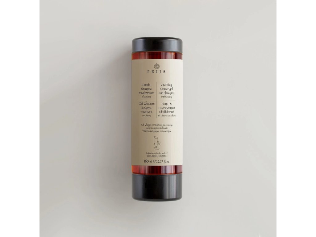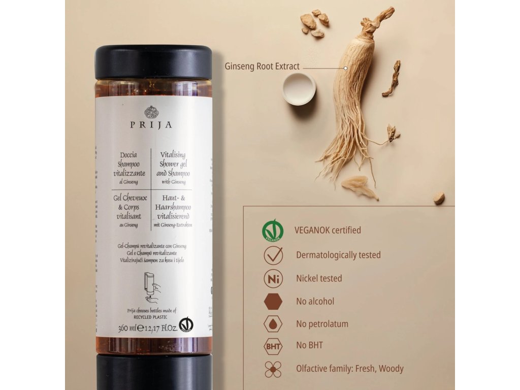 Revitalizační Gel na tělo a vlasy s ženšenem PRIJA 360 ml (CySoap dávkovač) jemně čistí pokožku a pokožku hlavy s omamnou vůní Prija a zanechává okamžitý pocit vitality a pohody po celém těle.