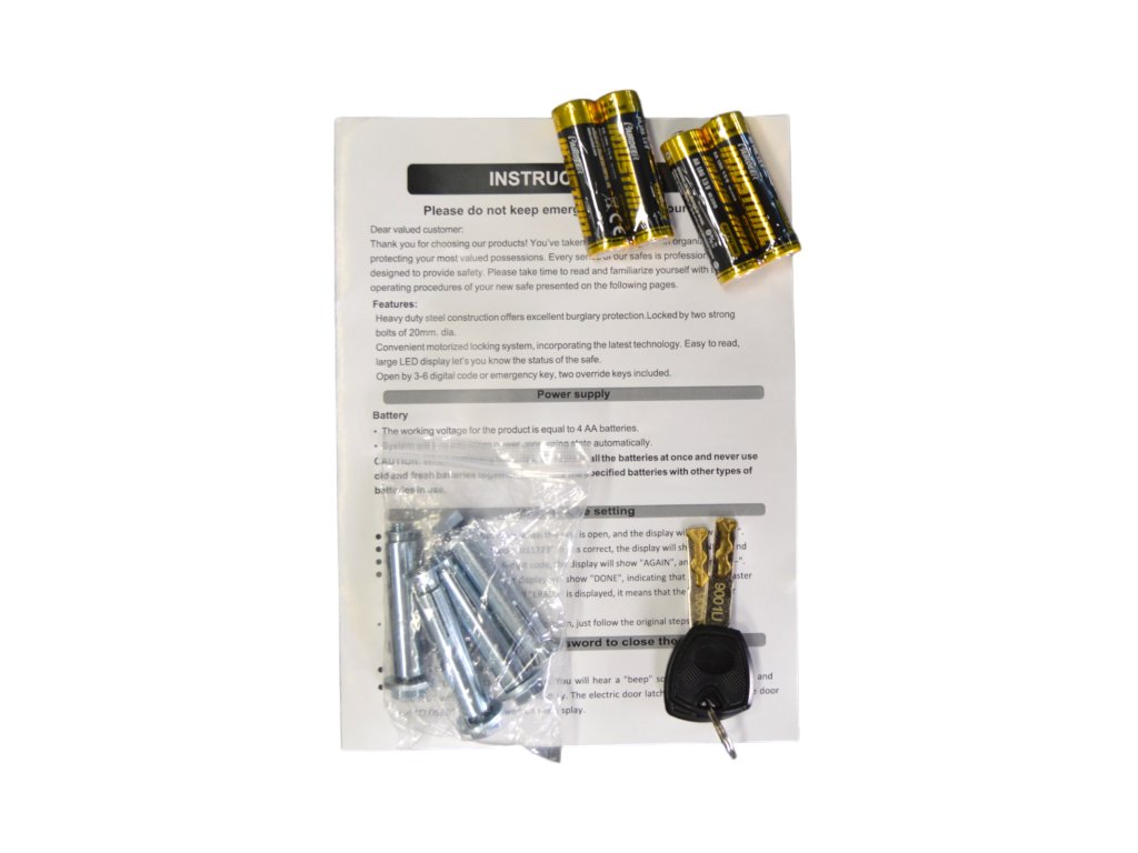 Součástí balení trezoru jsou AA baterie, 2x servisní klíč, instalační šrouby, návod k použití.