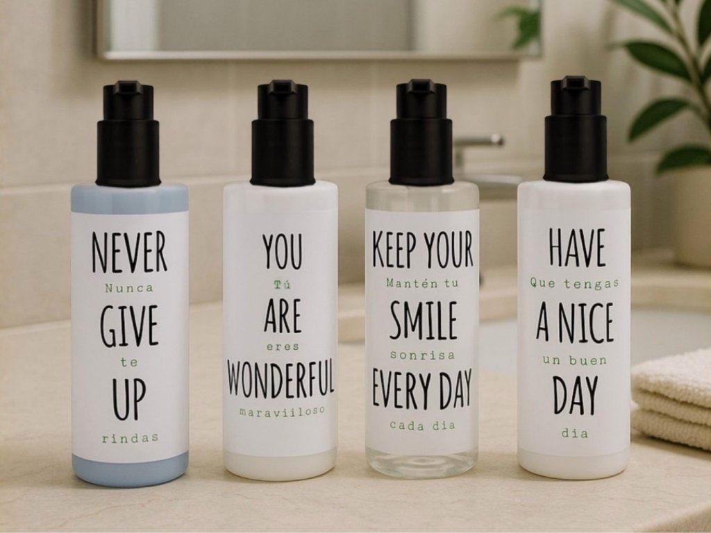 Mezi dostupné produkty patří sprchový gel/šampon 2 v 1, kondicionér, tělový krém a mýdlo na ruce.