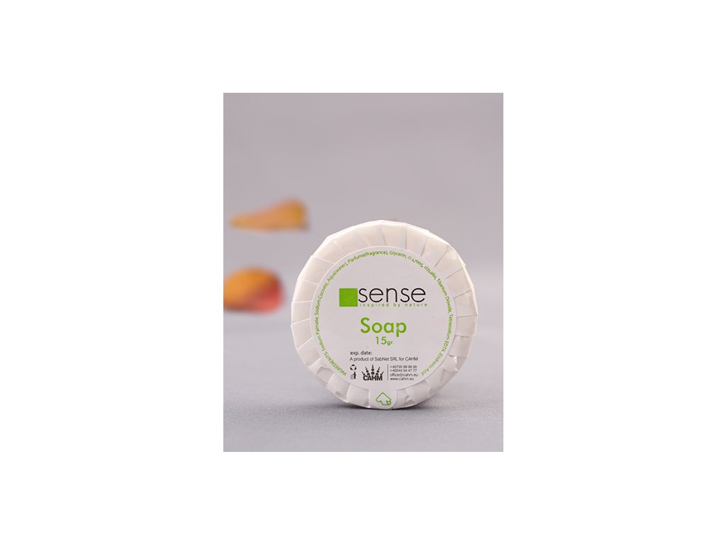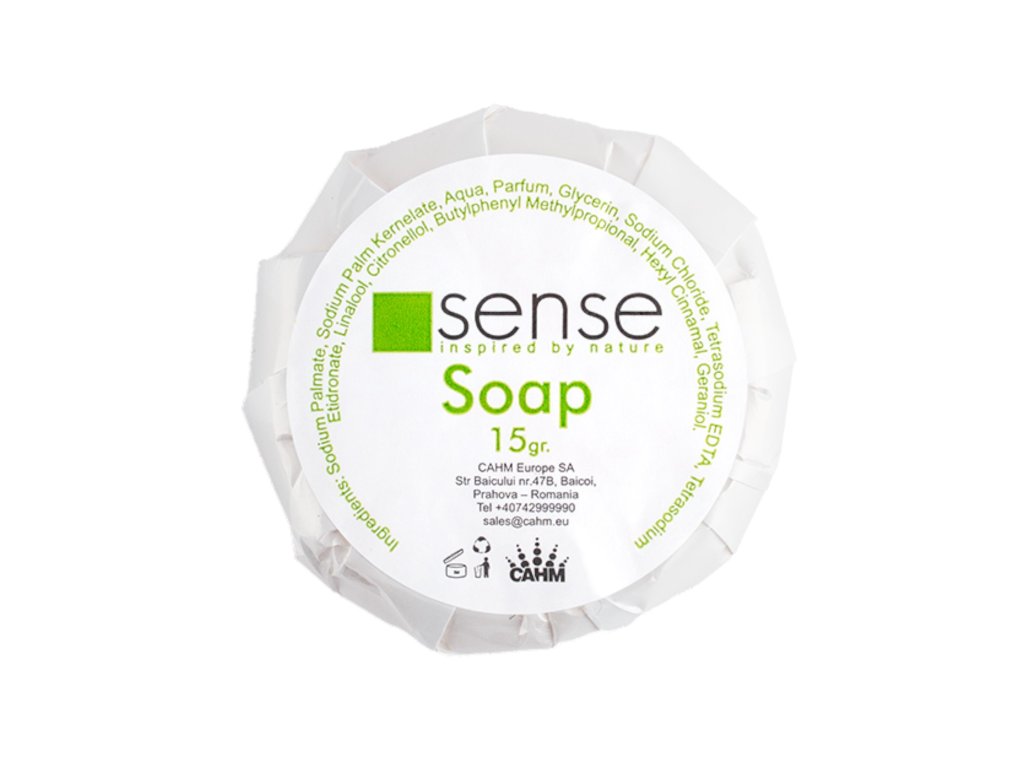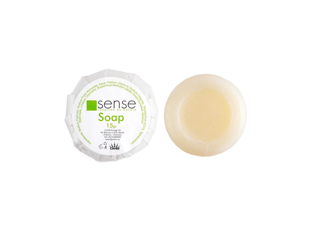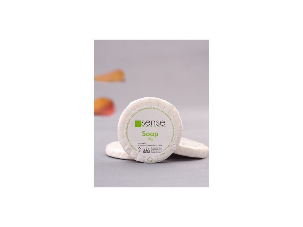 Hotelové mýdlo 15 g Sense je nezbytností za přijatelnou cenu, která musí být součástí každé hotelové koupelny. Má minimalistický a jednoduchý design, který se snadno integruje do jakéhokoli interiéru. Mýdlo je vyrobeno ze 100% rostlinných olejů. Baleno je ve skládaném voskovém papíře s jednoduchým otevíráním. Obal je voděodolný, recyklovatelný a biologicky odbouratelný. Parfém Dovelia - příjemná, nenásilná, neutrální vůně. Díky svému kulatému a elegantnímu tvaru se hodí ke každému typu pleti a přizpůsobí se jakékoli velikosti ruky.