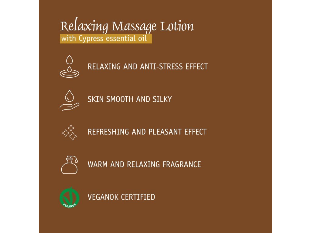 Emulze s lehkým, osvěžujícím a příjemným dotekem na pokožku ideální pro jemné masírování těla s relaxačním a antistresovým účinkem. Obsahuje Aloe Vera, osvěžuje a hydratuje, zanechává pokožku hladkou a hedvábnou. Obohacený o cypřišový olej poskytuje chvíle relaxace s osvěžujícím a příjemným účinkem.