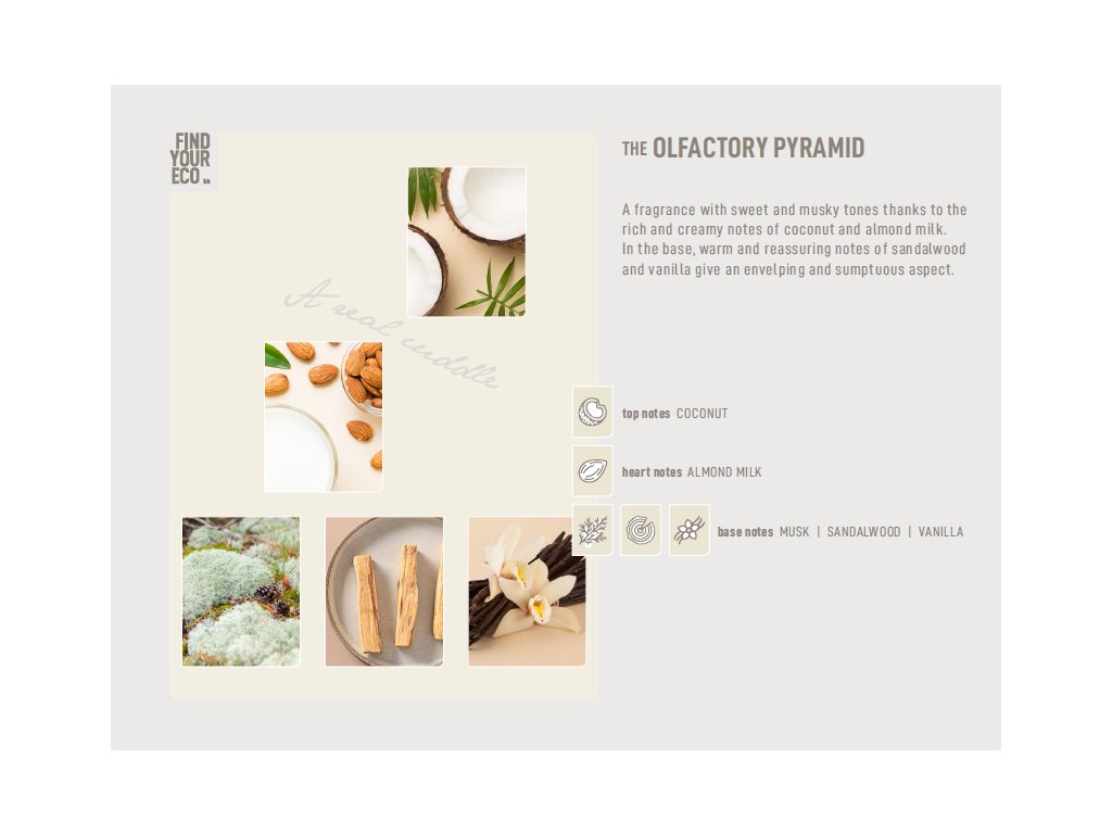 Sladká a pižmová vůně kombinuje tóny kokosu a mandlového mléka s teplými vůněmi santalového dřeva a vanilky. Receptury vyrobené ze surovin RSPO jsou dermatologicky testovány, veganské, bez silikonů, parabenů, SLES, vazelíny a přidaných ethoxylátů/PEG.